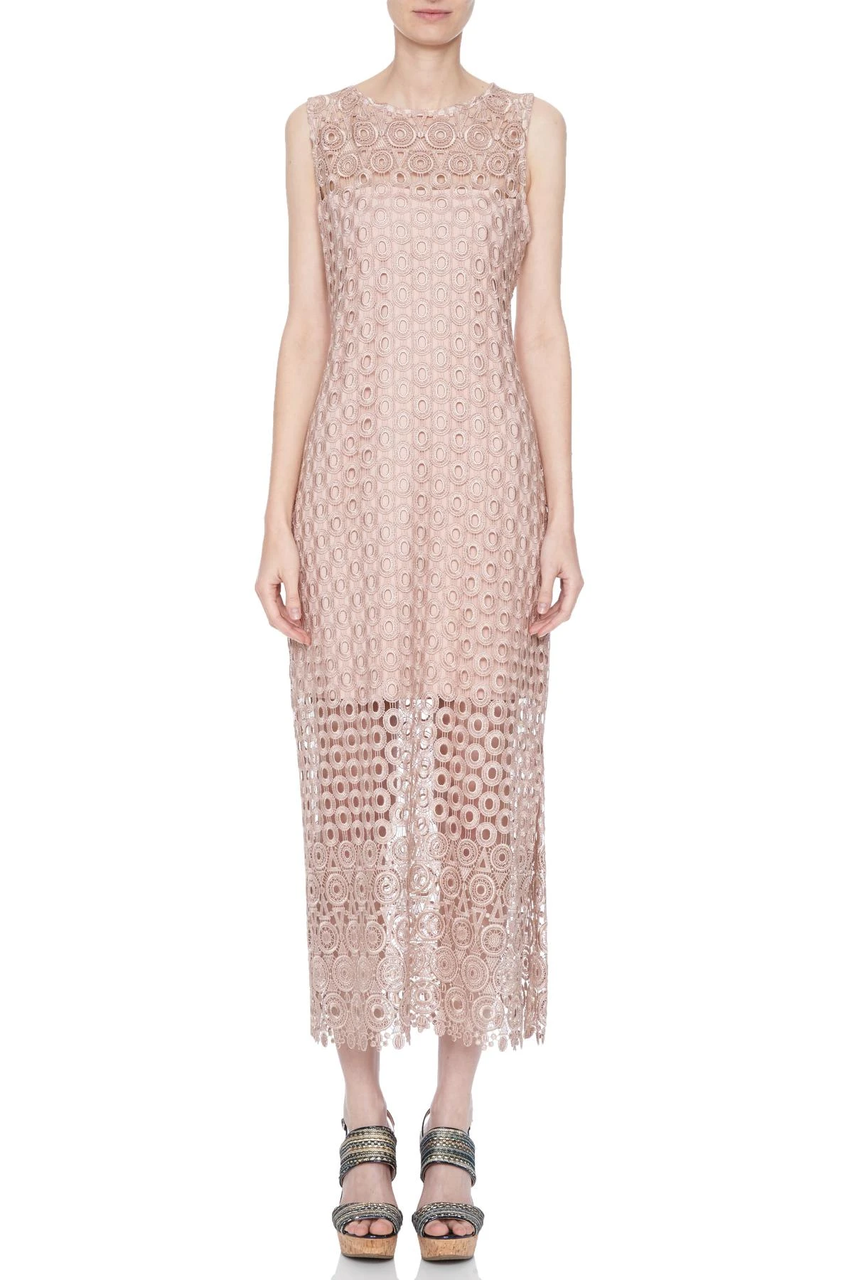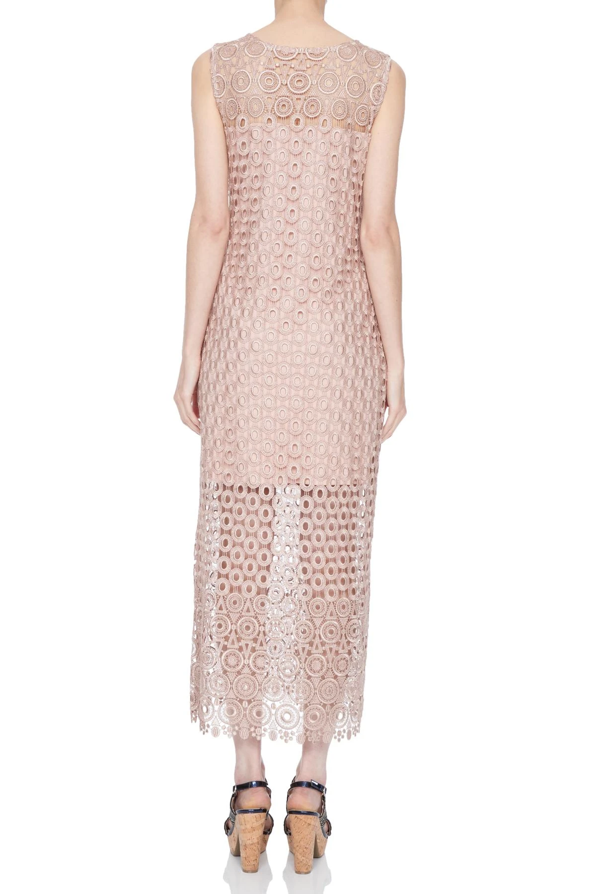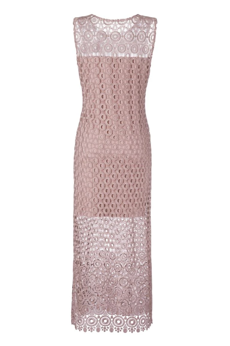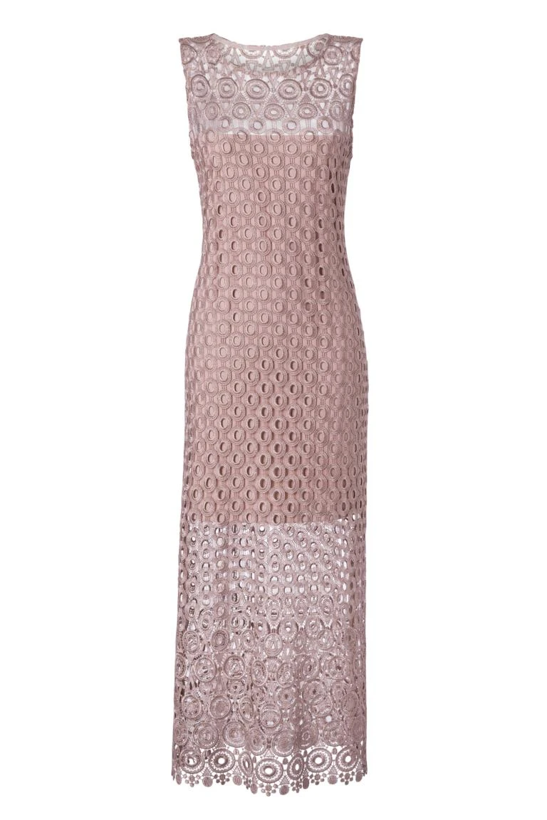 Lange mouwloos kant-jurk met ronde hals